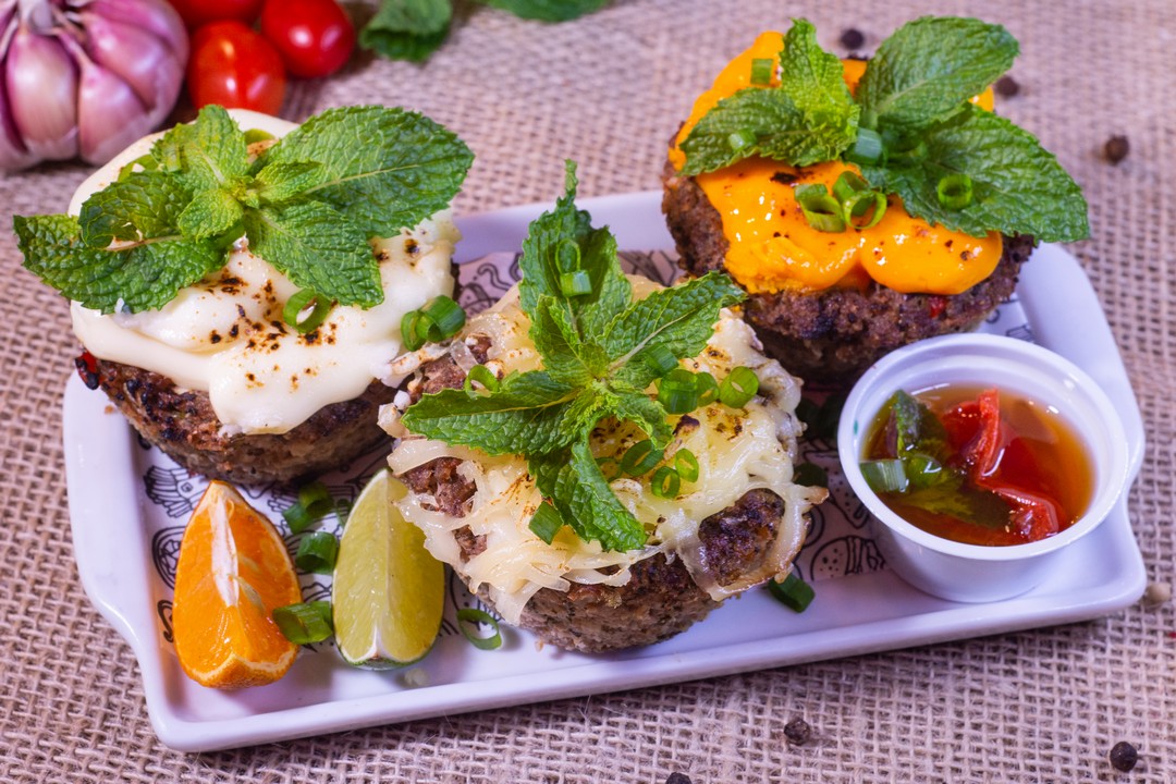 Um trio de quibe assado com 3 tipos de cobertura de queijos mineiros.