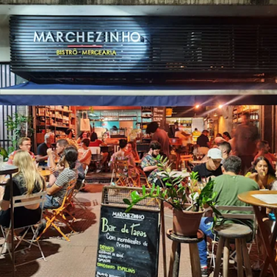 Marchezinho é um espaço dedicado a boa comida e bebida! Misto de bistrô e armazém, trabalhamos com ingredientes e quitutes que vem direto de pequenos produtores, trazendo qualidade e reaproximando o bairro de Botafogo do prazer de comer e beber bem. Servimos café da manhã com croissants, pães e embutidos artesanais. Cafés selecionados, produzidos por pequenos produtores e nosso suco do dia. No almoço, temos um cardápio simples e com comidas leves e saudáveis (sanduíches, quichés e saladas) para comer no local ou levar. A cada semana buscamos oferecer novidades. De noite propomos uma fina seleção de vinhos, drinks e cervejas artesanais para serem desfrutadas com porções de "tapas" feitos com produtos regionais. E durante todo o funcionamento o cliente pode descobrir produtos sustentáveis e orgânicos em nosso armazém para levar para casa.