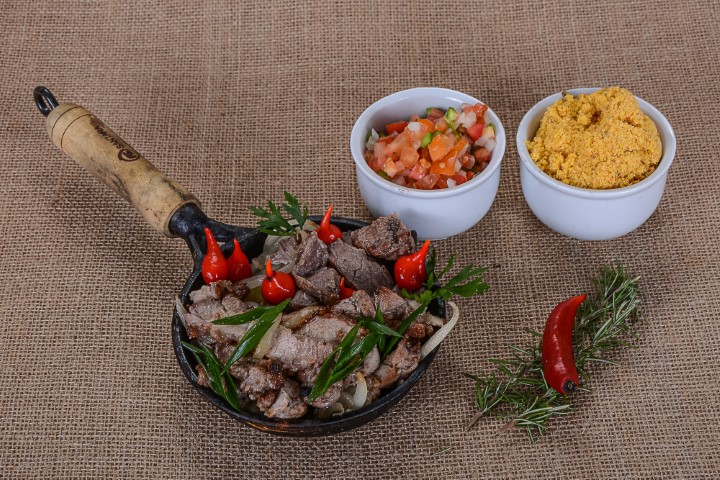 Pernil e contrafilé acebolado feito na brasa, com acompanhamento de farofa crocante e vinagrete.