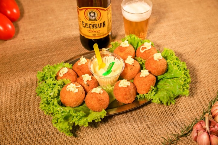 Bolinhos de massa de batata recheado com costela e mix de queijos, acompanhado de geleia de pimenta e molho agridoce