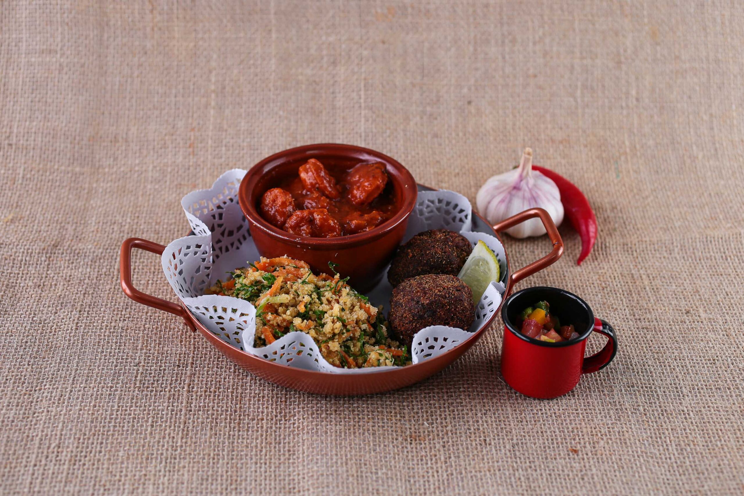 Petisco dividido em três partes: linguiça picadinha e temperada, farofinha “rica” e molhada e bolinhos de feijão. Acompanha molho de pimenta da casa.