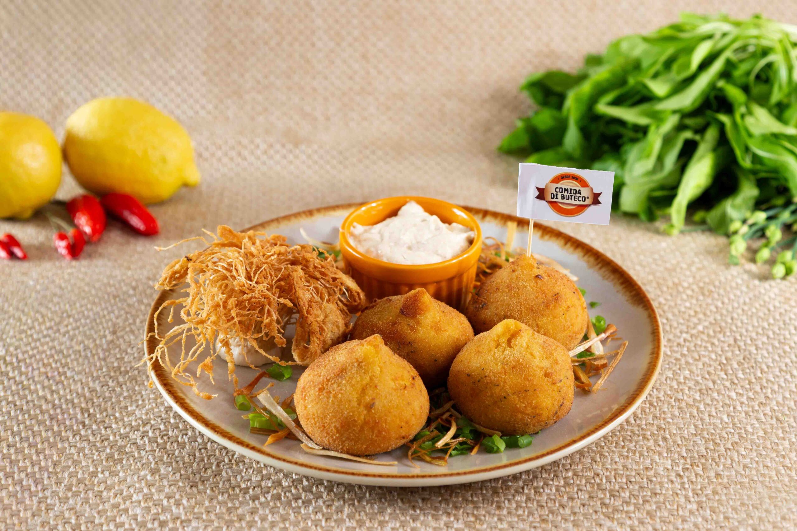 Coxinha com massa de abóbora com recheio de camarão, muçarela ralada, alho-poró, cebola, coentro picado e cream cheese.