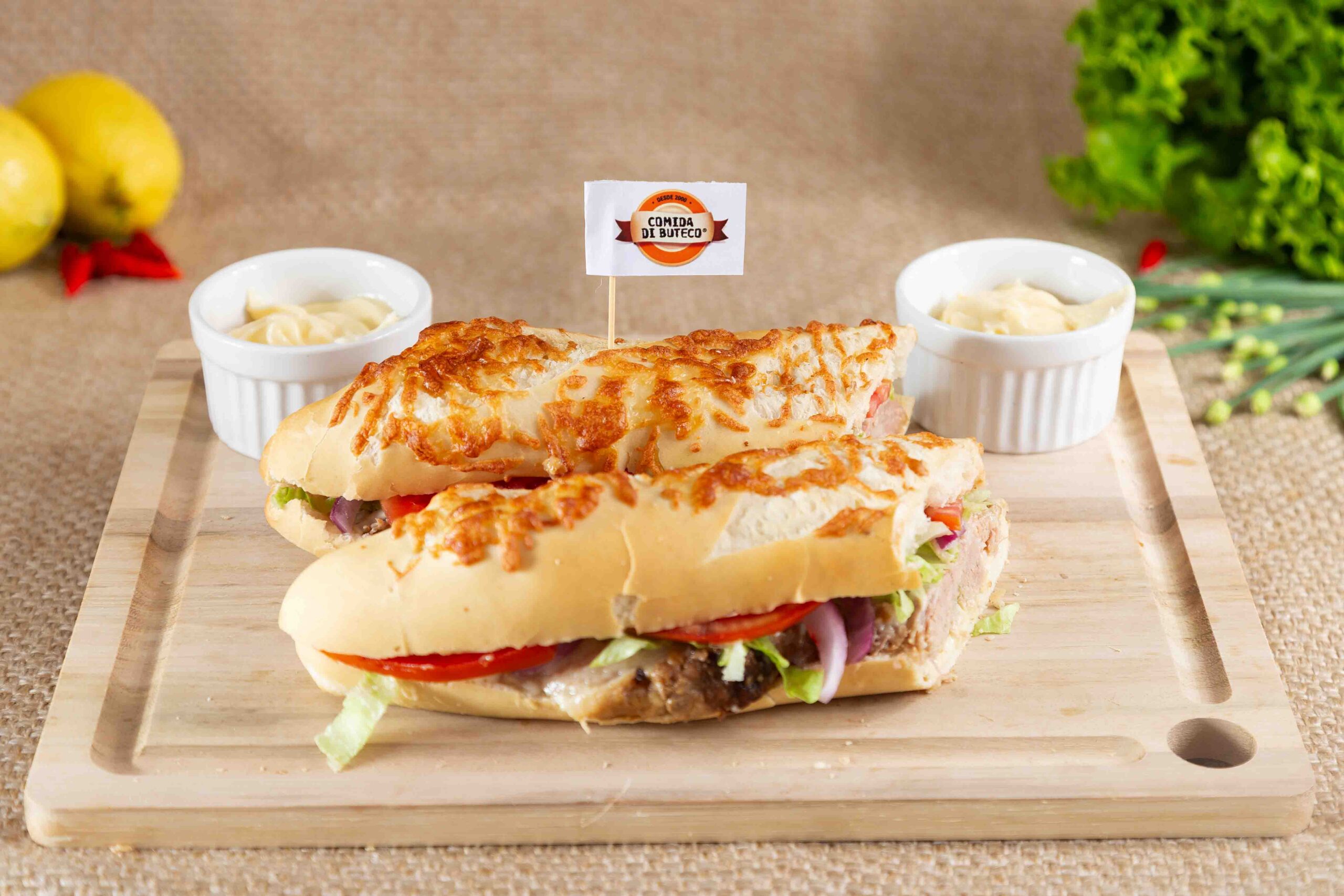 Cupim no bafo em um sanduíche de pão bengala com pasta de alho e uma salada com alface-americana, tomate e cebola-roxa.