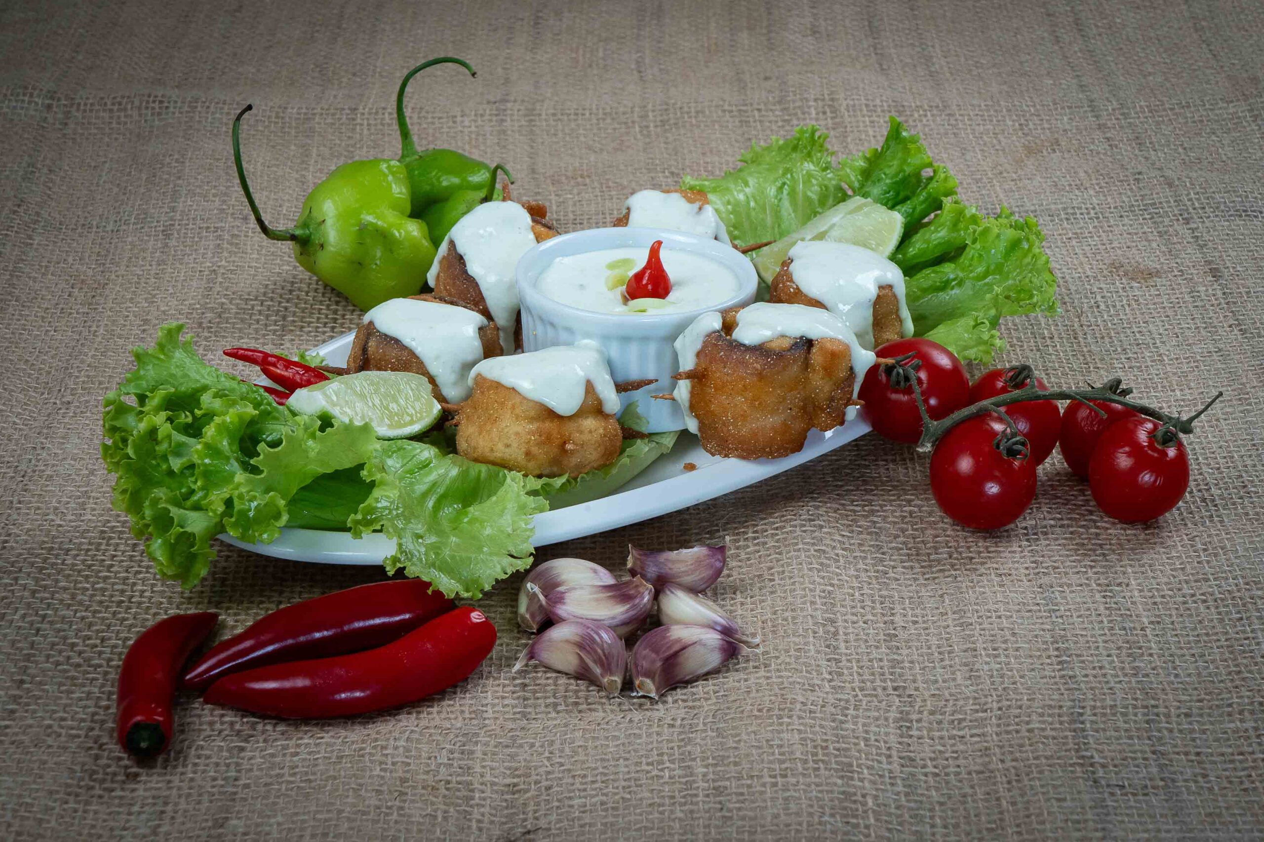 Filé de tilápia envolto com bacon e recheado com provolone, empanado e frito, servido com molho de alho-poró.