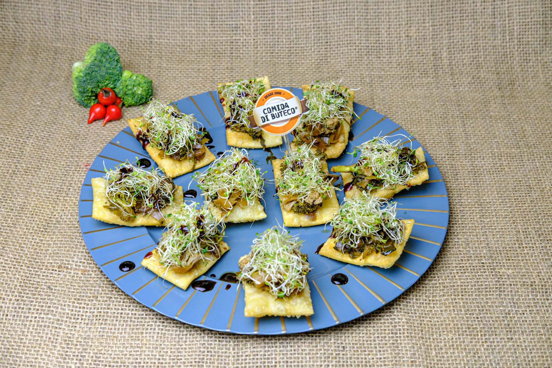 Snacks de massa de pastel, cobertos por um refogado de verduras ao molho oriental.