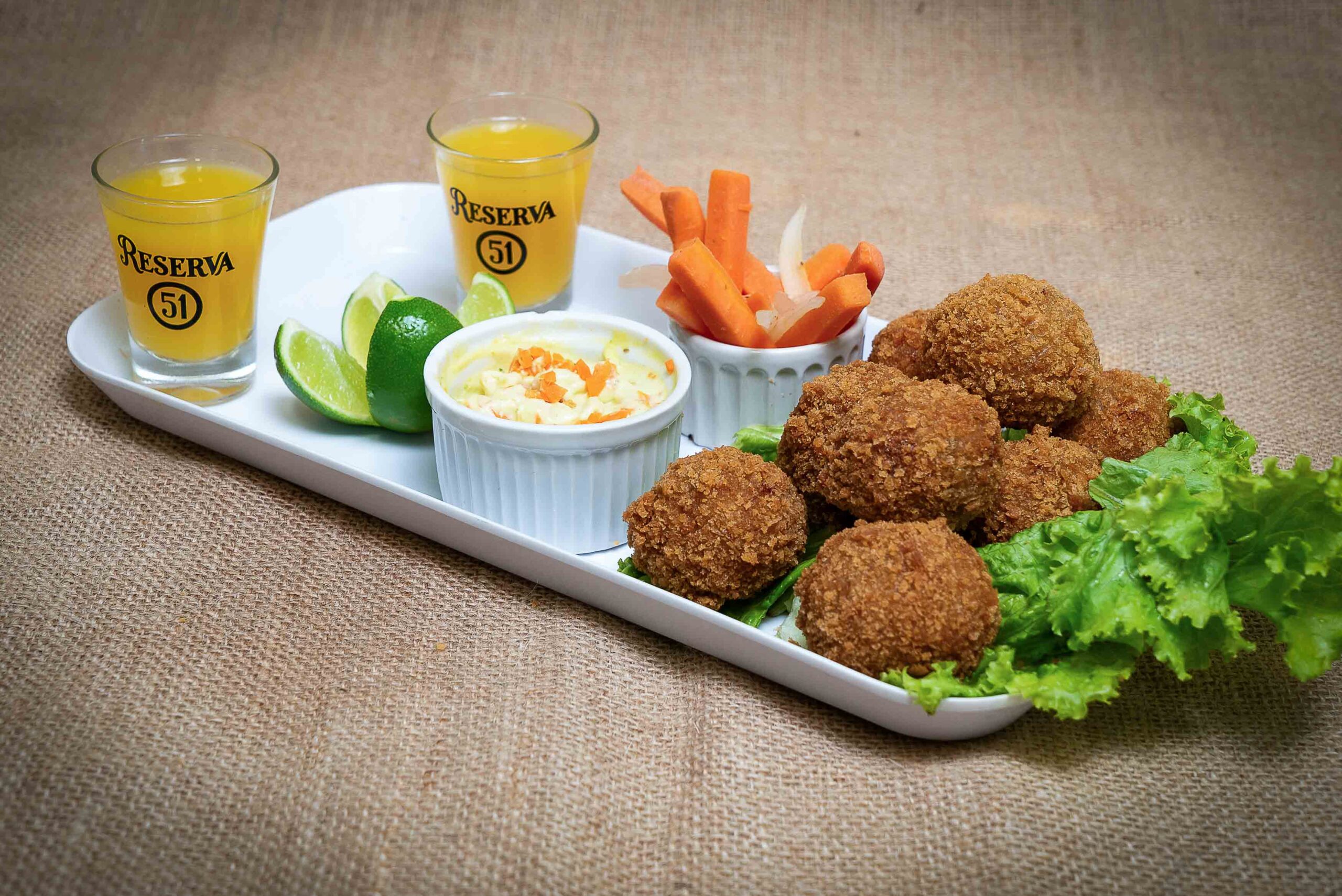 Bolinho de arroz com tilápia e molho tártaro da Maria Célia e picles de cenourinha.