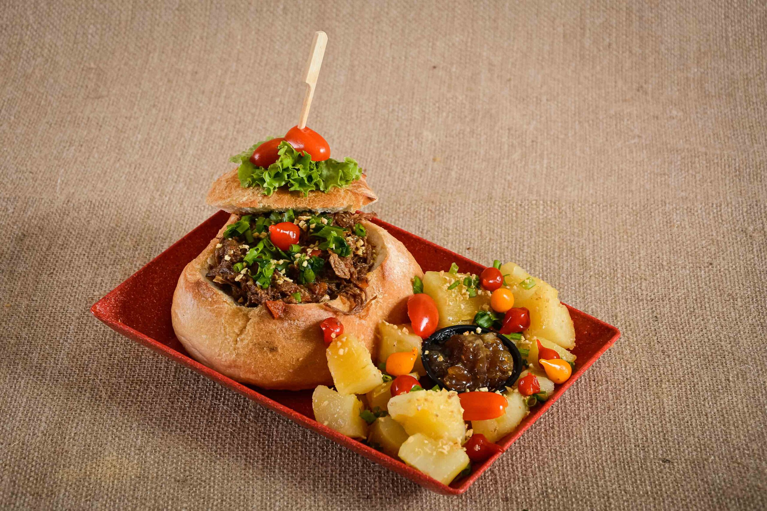 Carne cozida desfiada ao molho, servida na panhoca, acompanhada de macaxeira cozida na manteiga de garrafa ao alho e cebola caramelizada.
