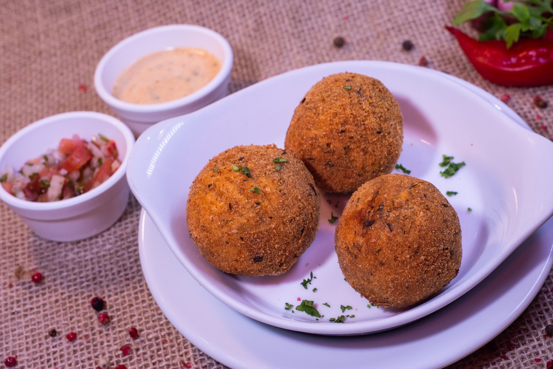 Bolinho com desfiado de picanha recheado com muçarela. Apenas empanado, sem massa.