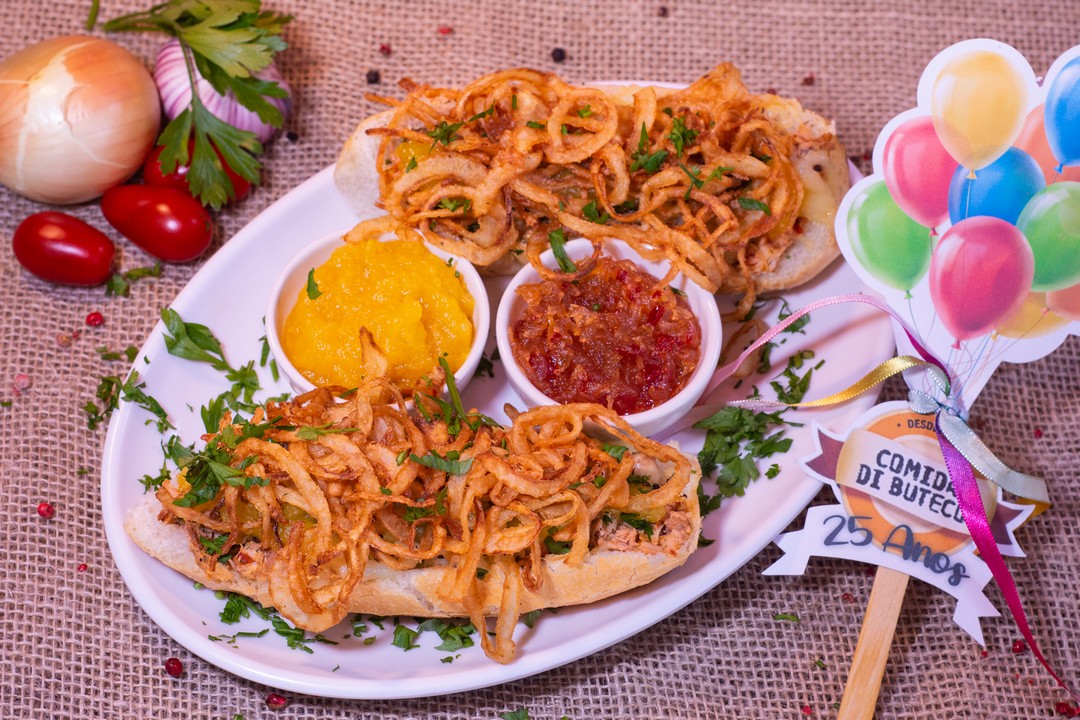 Um lanche aberto com pernil desfiado coberto de purê de maçã e crisps de cebola, acompanha geleias de pimenta e tomate.