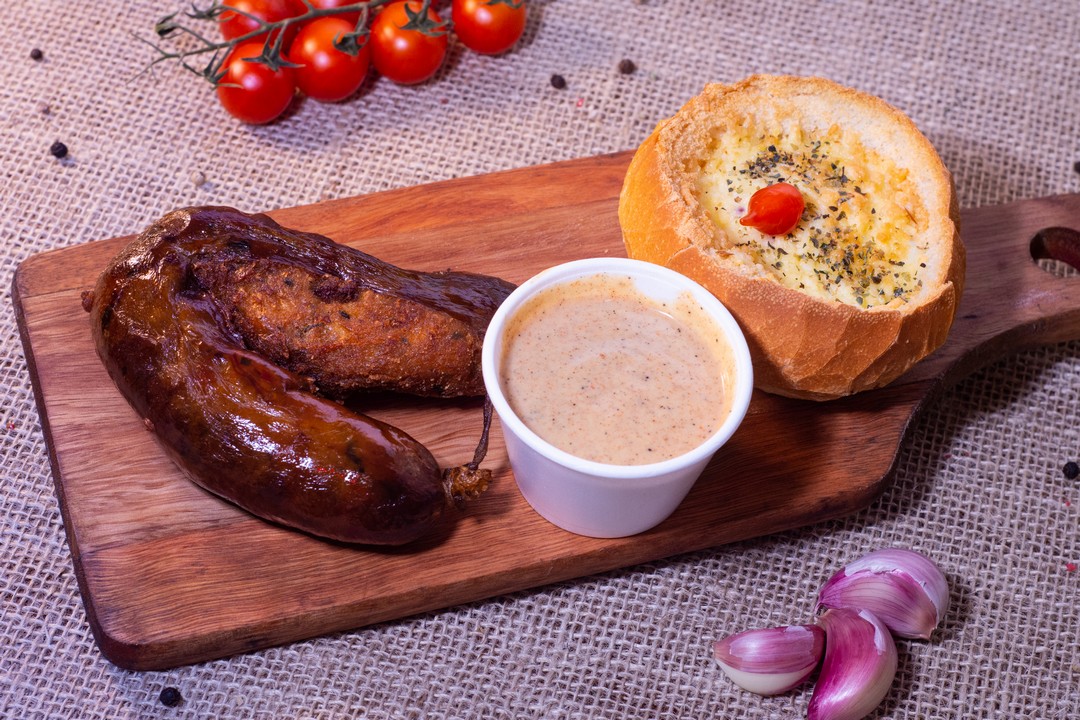 Linguiça alheira frita, acompanhada de um pão francês redondo recheado com um ovo e coberto com parmesão e pimenta-biquinho. Acompanha nosso molho de mostarda e mel.
