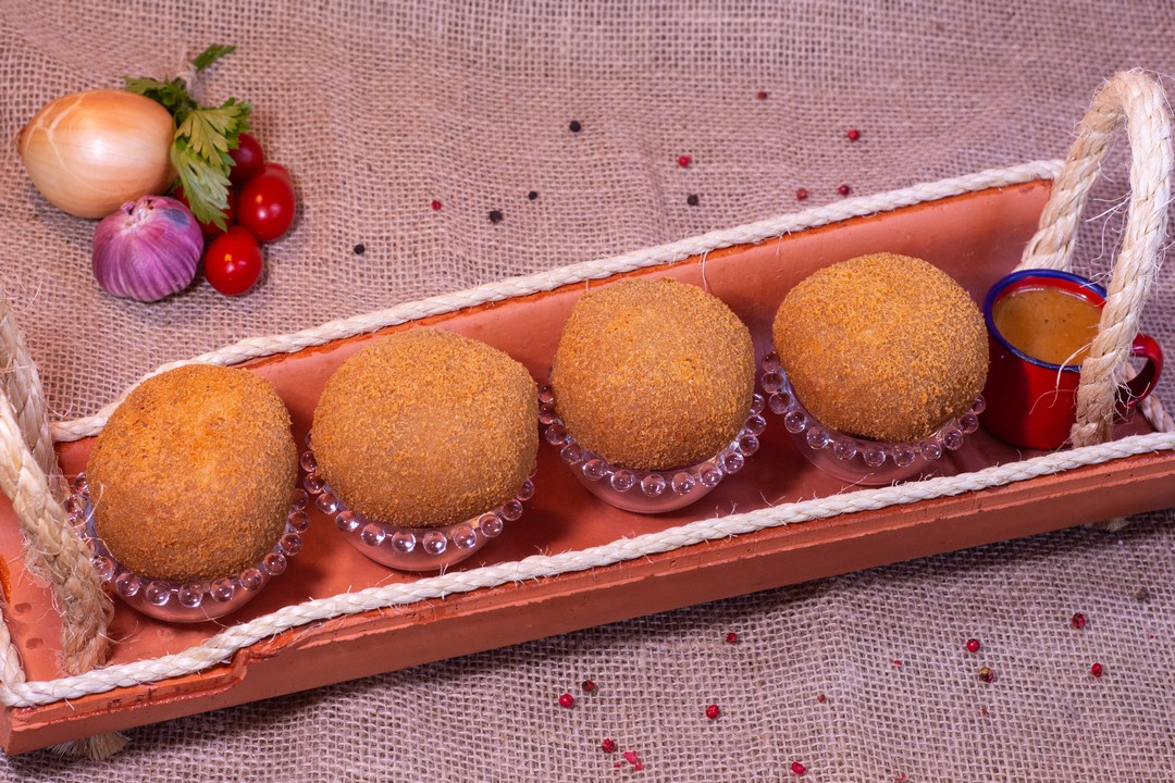 Bolinho de tutu de feijão recheado com linguiça mineira e calabresa, bacon e refogado de couve.