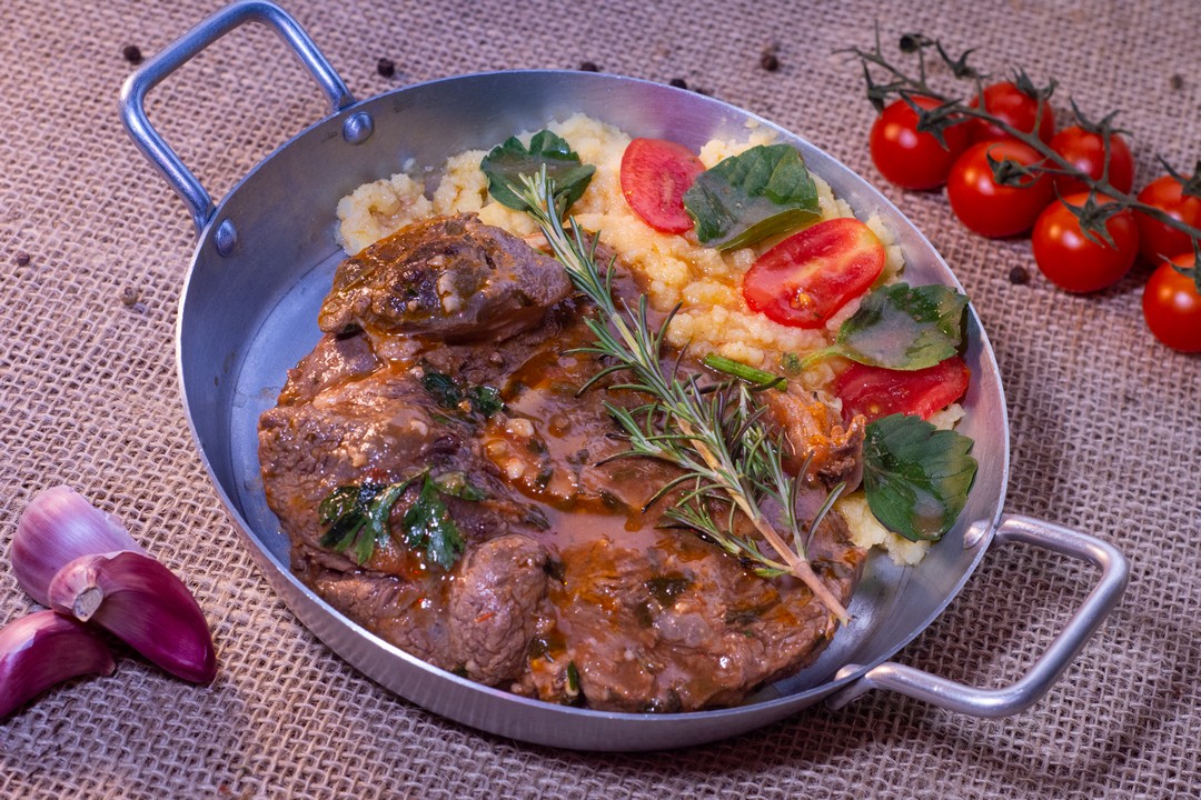 Ossobuco cozido com polenta.