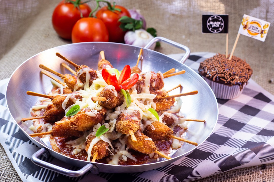 Miniparmigiana de frango no palito com molho pomodoro fresco e queijo muçarela e bolinho de aniversário.