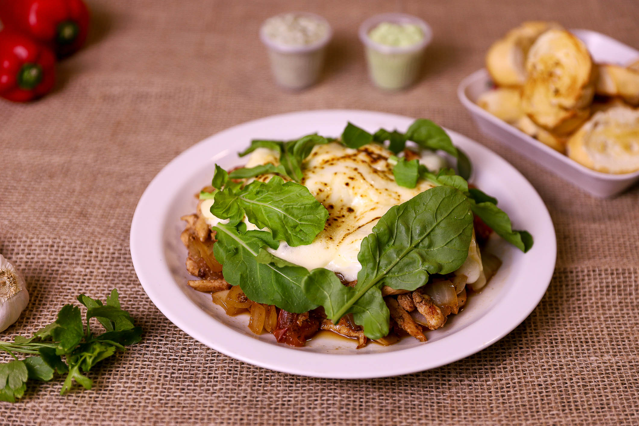 Iscas de frango suculentas com requeijão, muçarela e chips de quiabo crocante. Acompanha molhos de gorgonzola e maionese de rúcula.