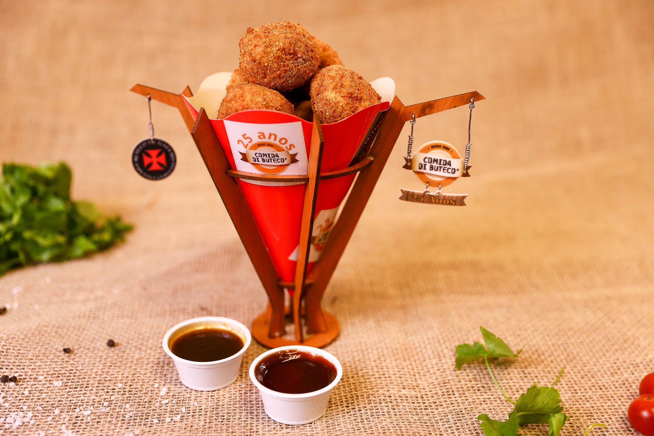 Bolinho de carne-seca desfiada, misturado com requeijão cremoso e pimenta-biquinho, recheado com muçarela e empanado na farinha panko.