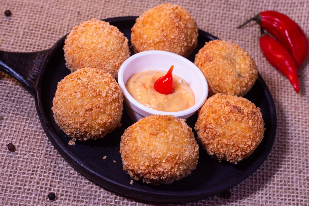 Bolinho de batata com filé de tilápia desfiado, recheado com queijos provolone e Catupiry.