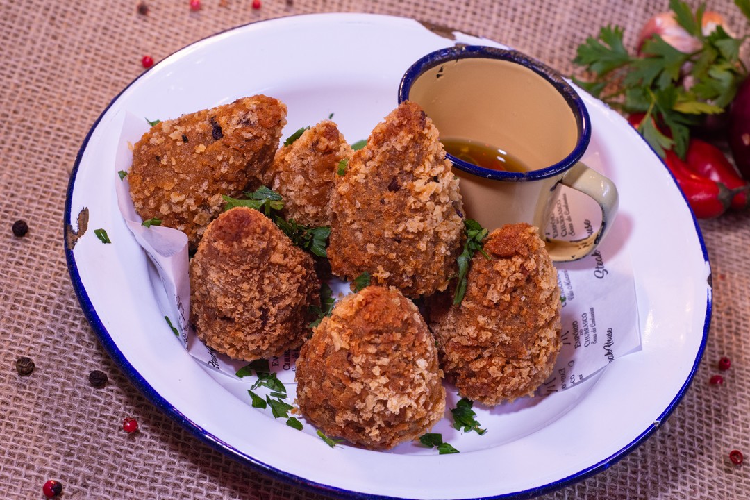 Coxinha de rabada. Acompanha molho de pimenta artesanal.