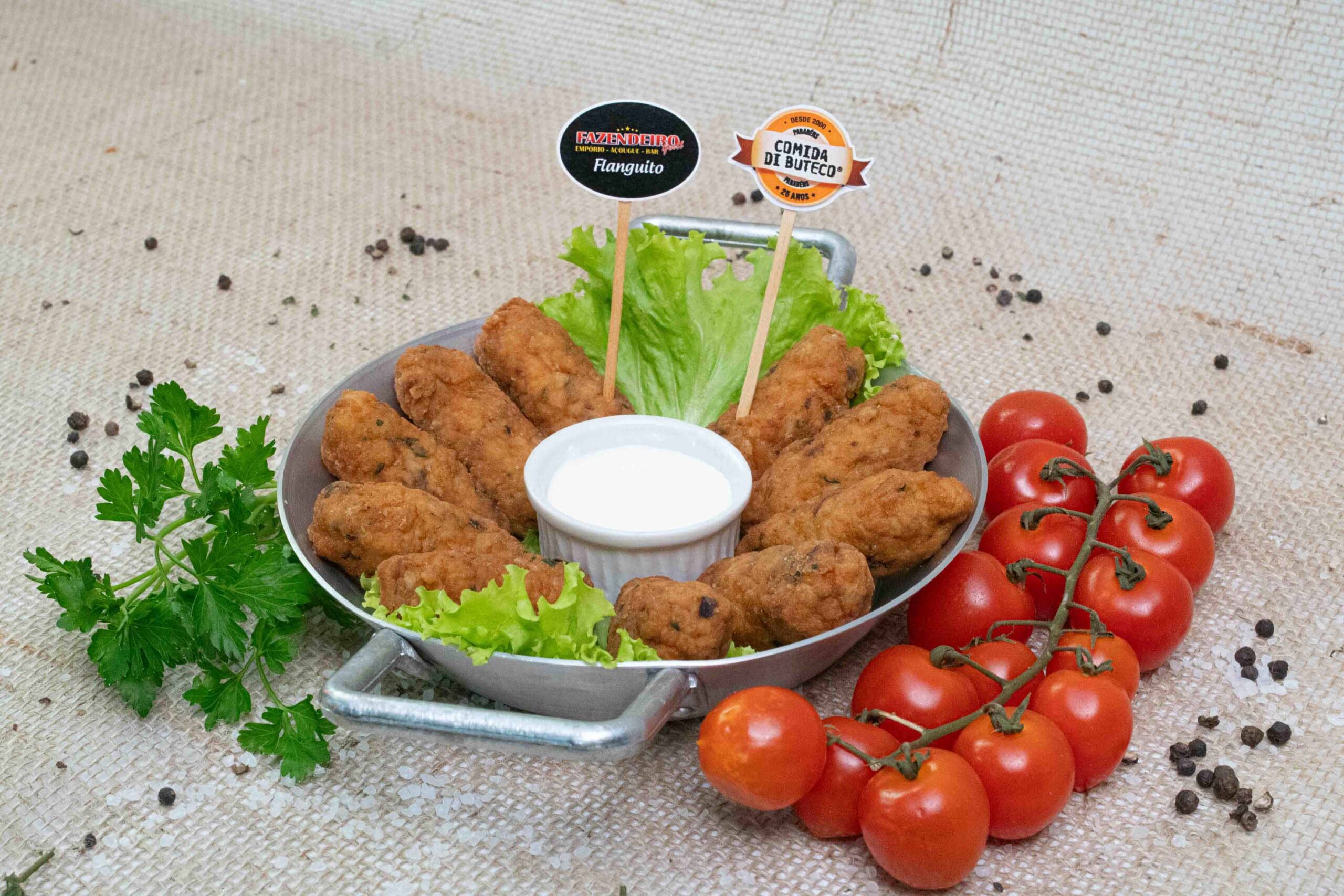 Croquete de frango com um toque de gengibre. Acompanha um molho mineiro.