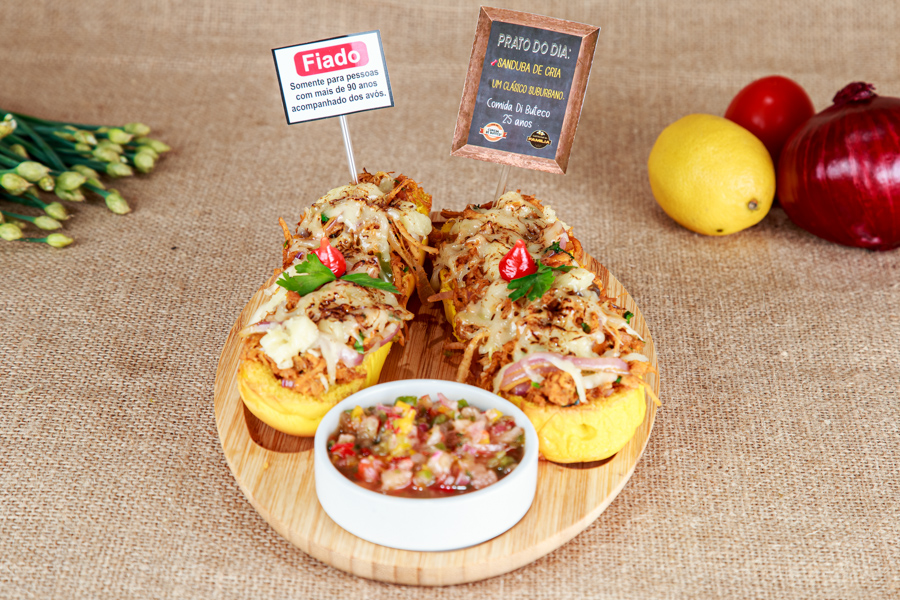 Clássico sanduíche de pernil desfiado, marinado com especiarias e feito na cebola caramelizada. Servido no pão artesanal com manteiga especial e molho à campanha de abacaxi com hortelã apimentado.