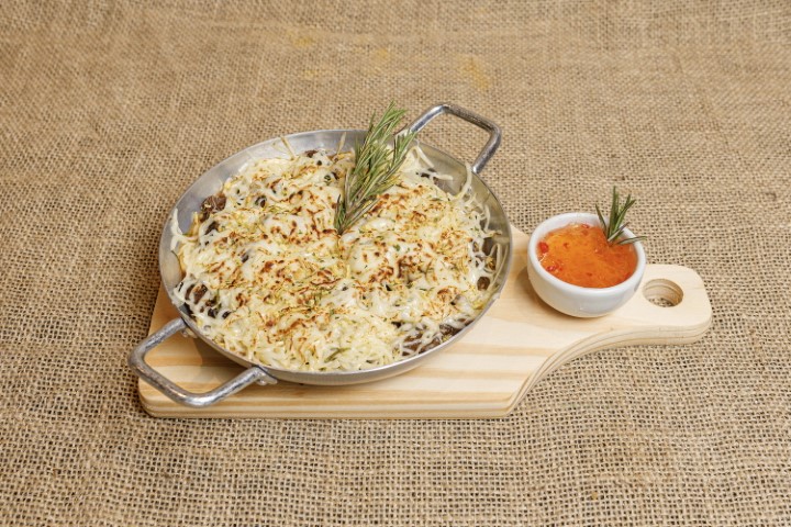 Costela servida com queijo derretido sobre um purê de batatas cremoso. Costela servida com queijo derretido sobre um purê de batatas cremoso.