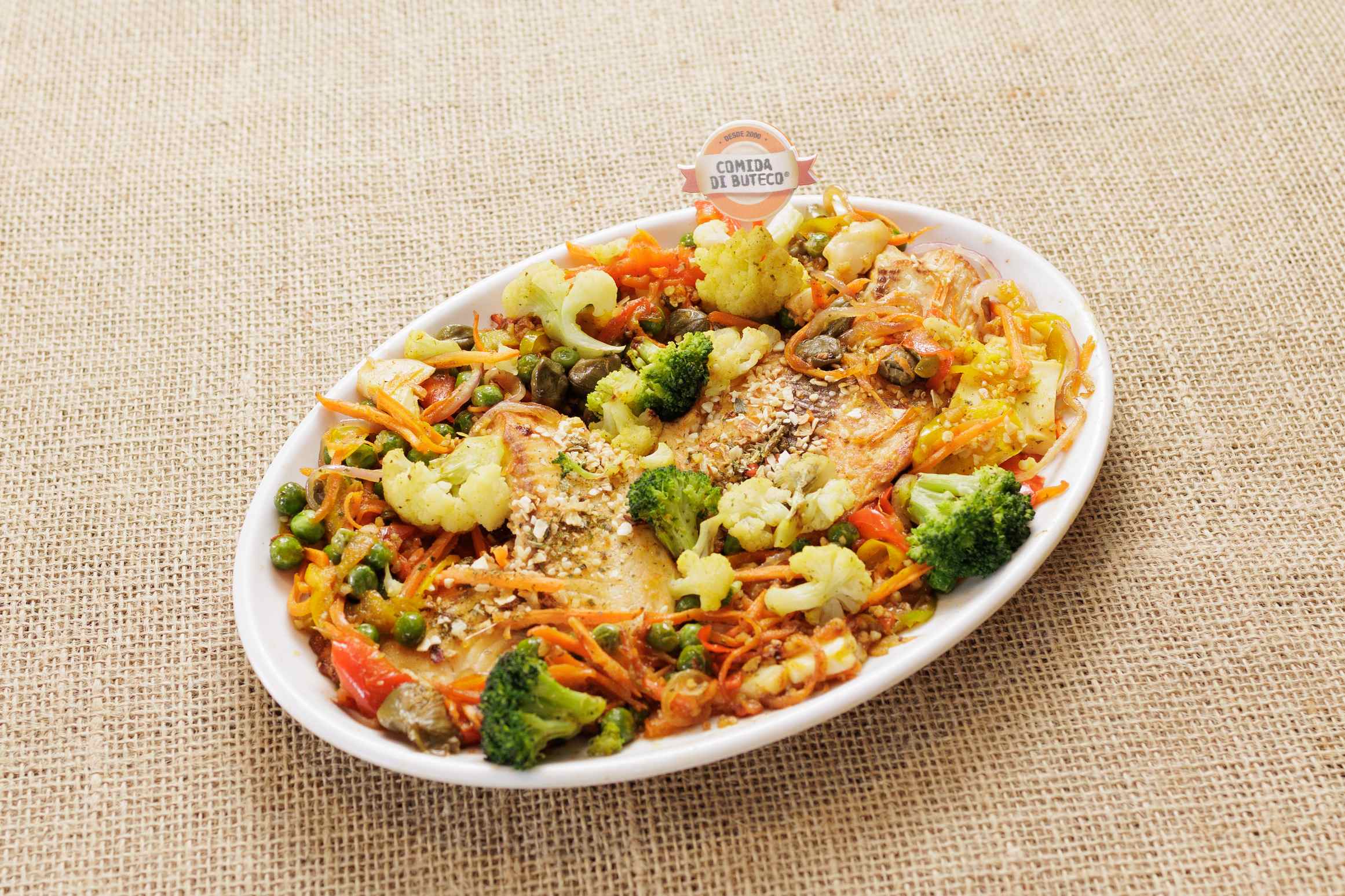 Filé de tilápia da chapa, temperado no azeite com brócolis, couve-flor, champignons e alcaparras.