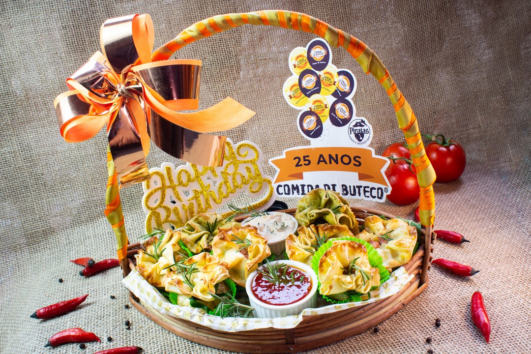 Massa wantan assada em formato de vulcão, contém 8 unidades, divididas em 4 sabores: Vegetariano, Moda Caipira, Frango Cremoso e Napolitano. Acompanha molhos de parmesão e sweet chilli para realçar os sabores.