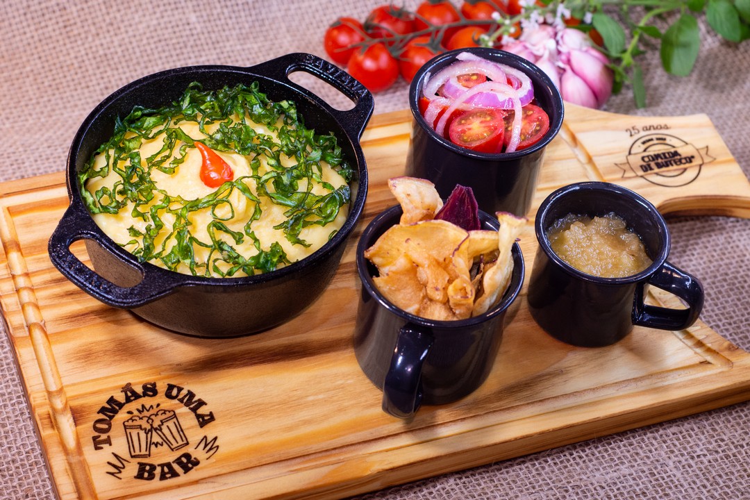 Escondidinho de mandioquinha com cupim e chips de batata-doce, acompanha salada de tomate-cereja com cebola-roxa e geleia de abacaxi.