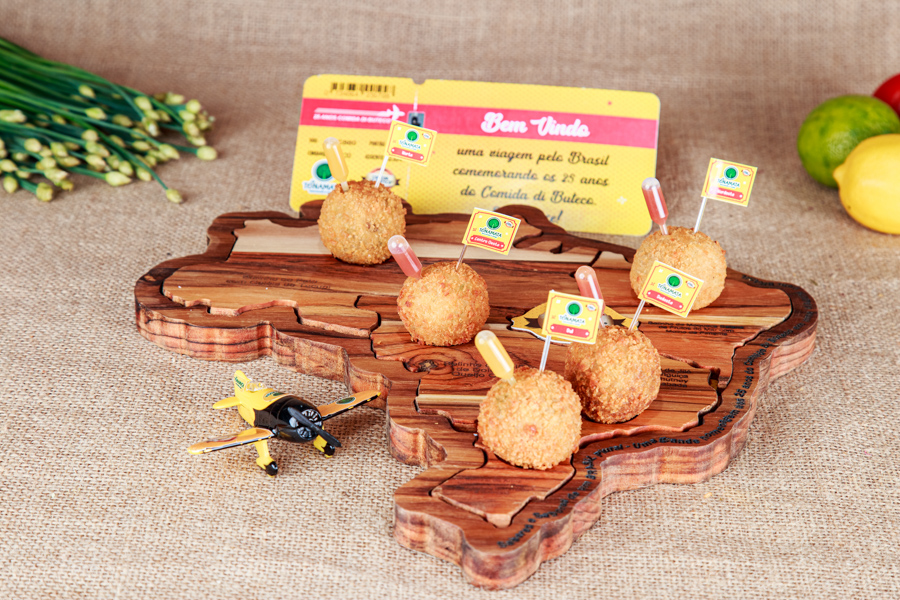 5 tipos de bolinhos, representando as regiões do Brasil: Norte – bolinho de pato com geleia de tucupi; Nordeste – bolinho moqueca baiana de frutos do mar com molho de pimenta; Centro-Oeste – bolinho de baião de dois com queijo coalho; Sudeste – bolinho de jiló com linguiça mineira com chutney de goiabada; Sul – bolinho de arroz carreteiro com ragu de costela defumada.