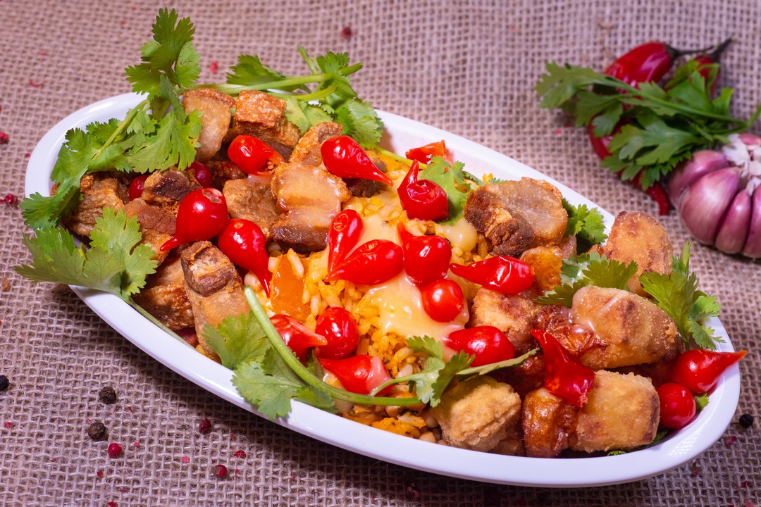 Baião de dois cremoso, queijo de coalho à milanesa e torresmo em pedacinhos. Acompanha molho de pimenta e melado de cana.