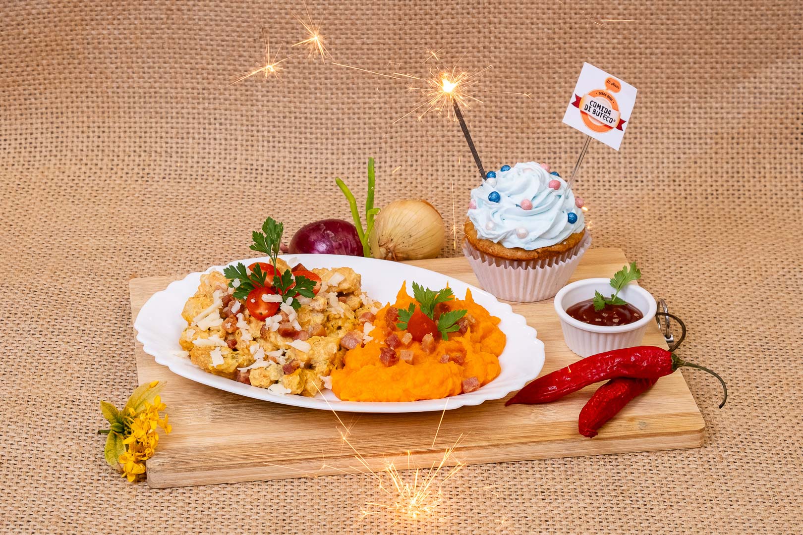 frango com creme de bacon e purê de abóbora.