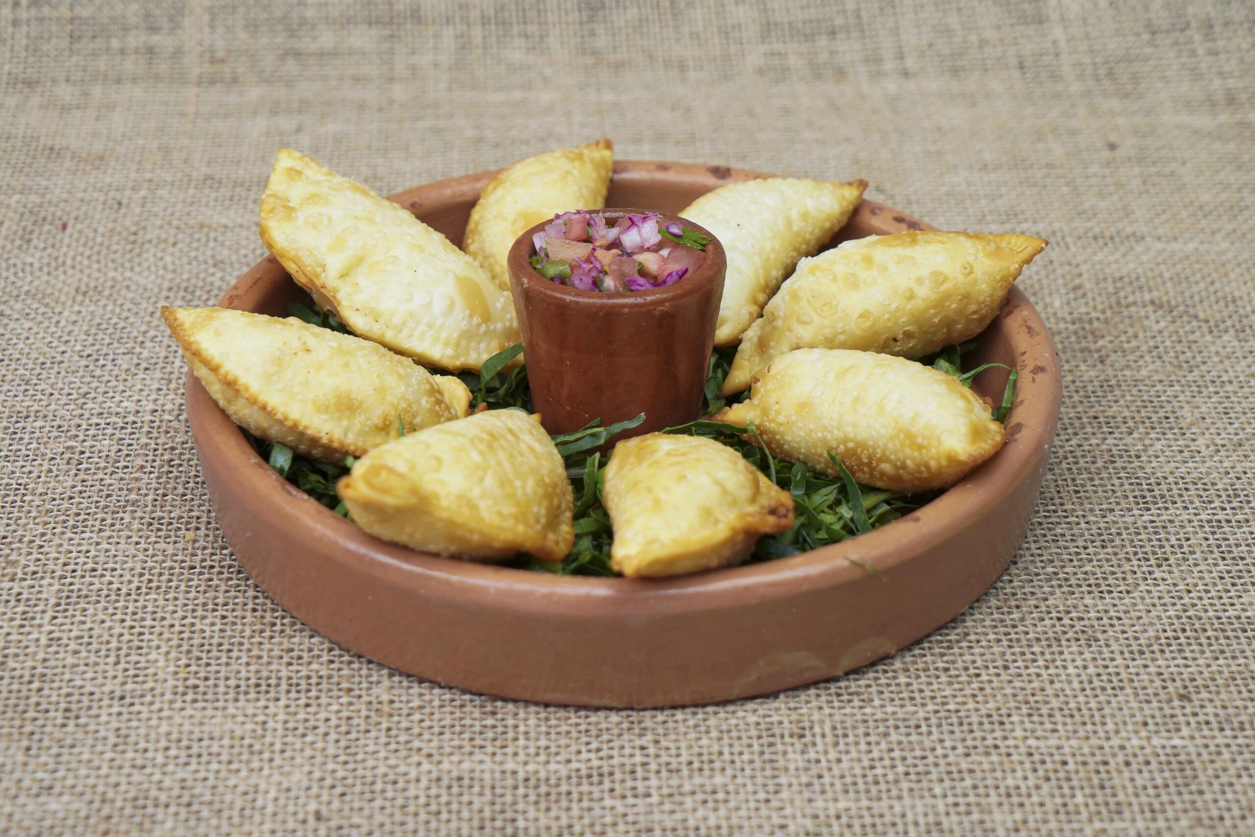 8 pastéis recheados com carne serenada na nata, queijo coalho e banana frita, acompanha vinagrete de tomate e repolho-roxo.