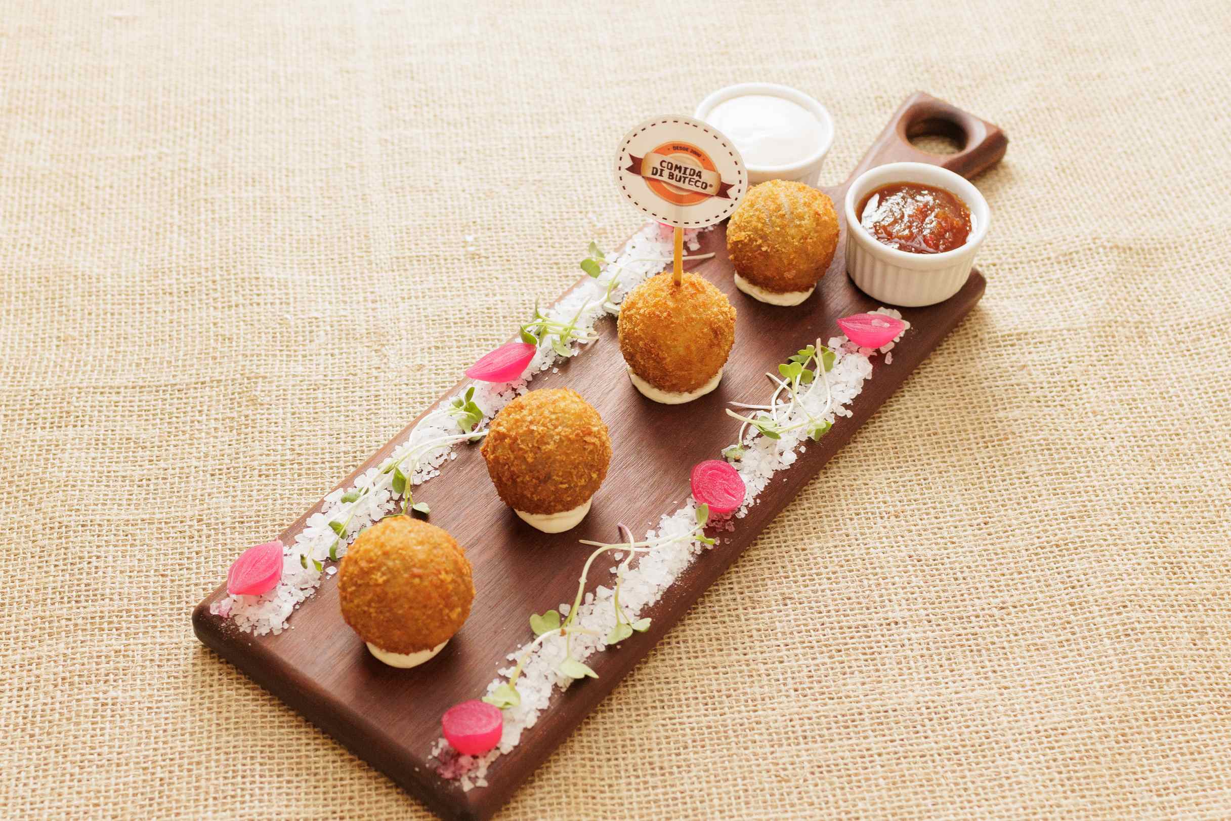 bolinho de picanha desfiada, cremosa por dentro e crocante por fora, na base de cream cheese. Acompanha molho de limão-siciliano e geleia de abacaxi com pimenta.
