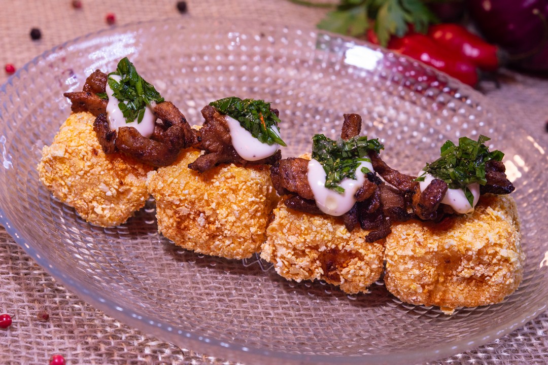 dadinho de quirera de milho, feito à base de creme de milho e leite, queijo coalho, acompanha uma barriga de porco oriental, aioli de pequi, e picata de salsinha.