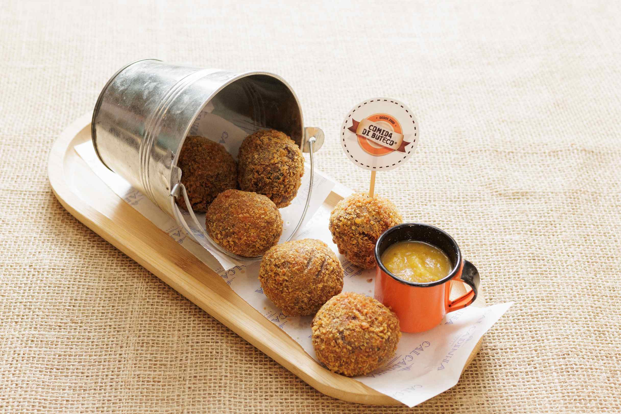 bolinho de rabada com recheio de queijo coalho. Acompanha molho de pequi com abacaxi e emoção de pimenta-calabresa.