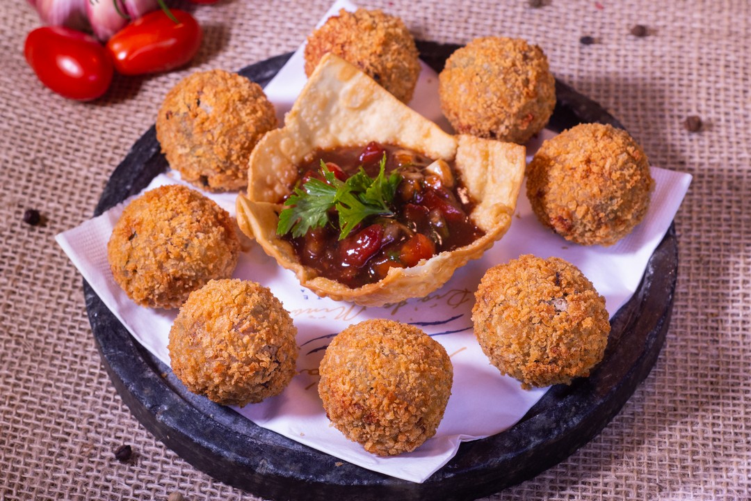 bolinho de feijão-tropeiro, acompanha molho vinagrete.