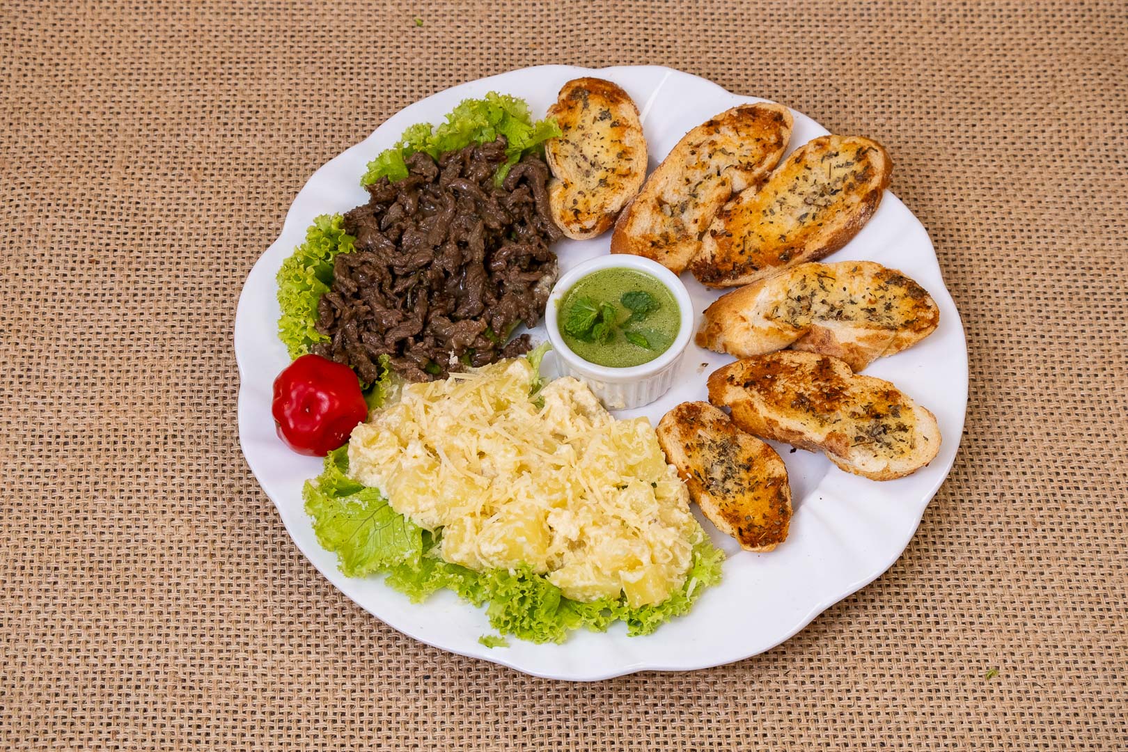 filé-mignon no molho de mostarda e mel, acompanhado de batata gratinada e baguete de alho.