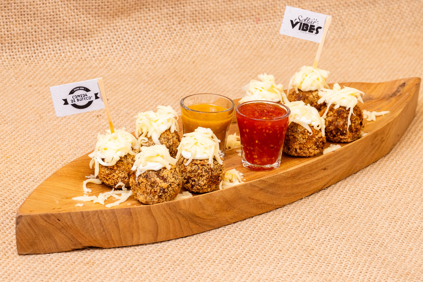 carne de panela, recheada com queijo muçarela, sem massa e empanada na farinha panko. Acompanhada de uma geleia de pimenta-biquinho.