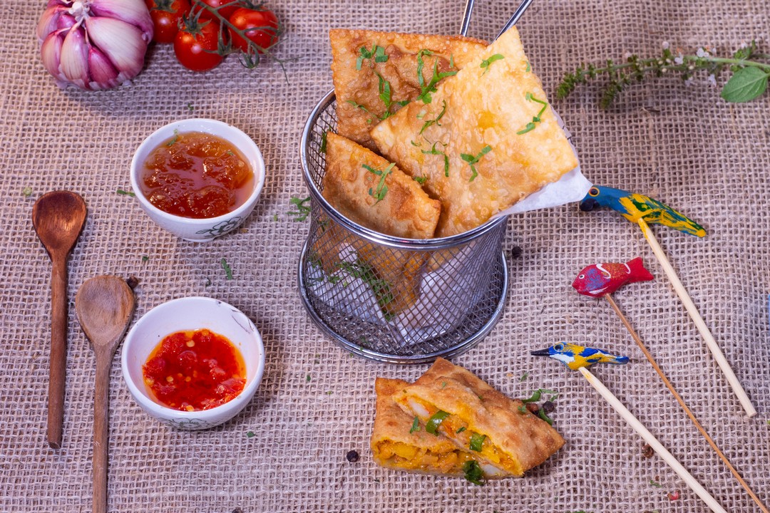 minipastel recheado de bobó de camarão pistolão e camarão-de-sete-barbas da maria. Acompanha geleia de seriguela e molho de pimenta com azeite extravirgem.