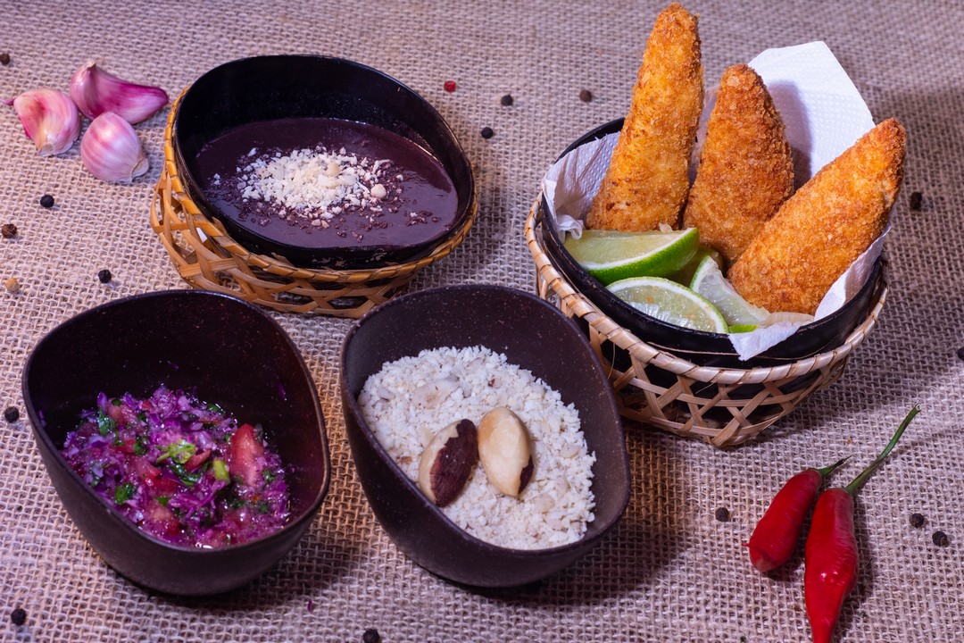 tiras de filhote (peixe amazônico) empanado e açaí puro. Acompanha farofa de castanha-do-pará e vinagrete de repolho.