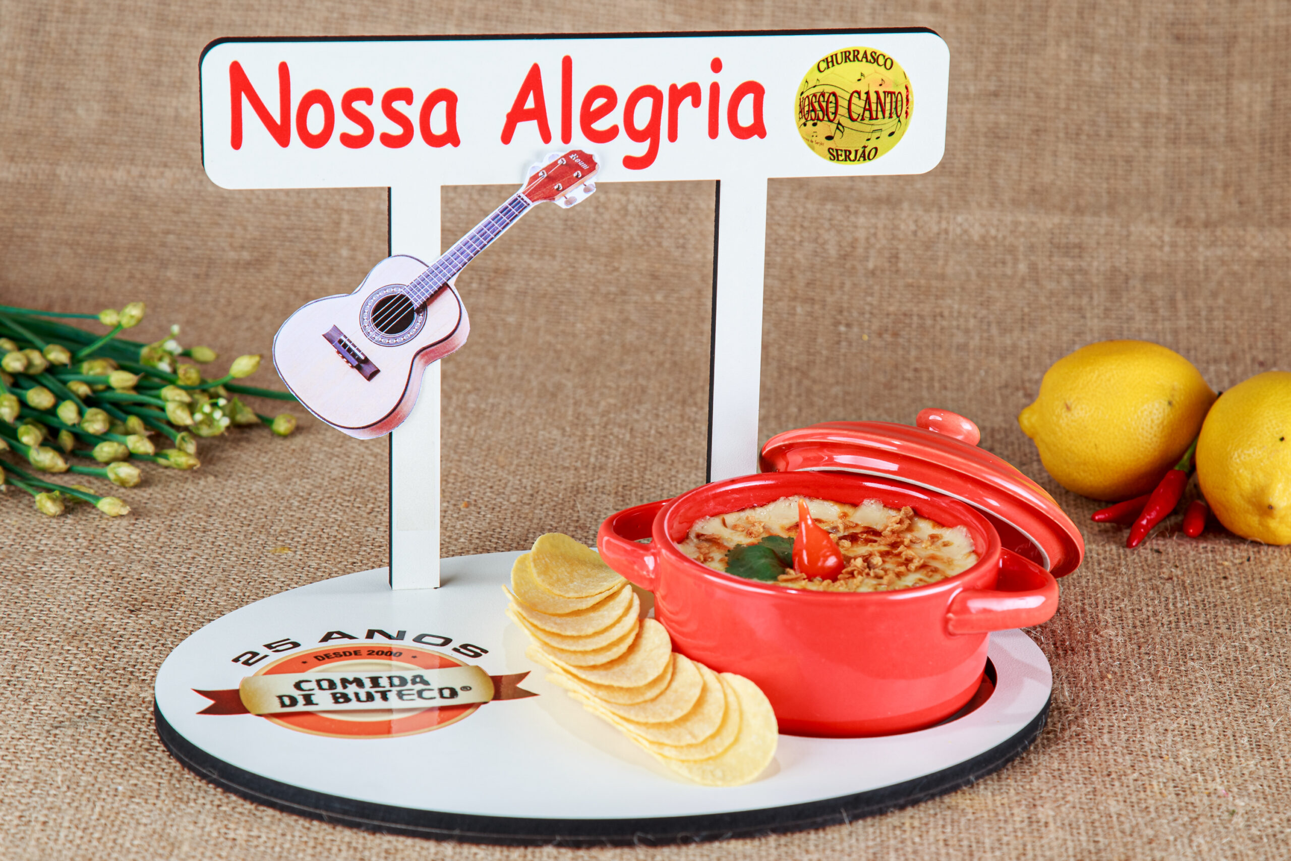 picanha suína assada e dourada na brasa, fatiada e envolta em um creme de requeijão e milho. Tudo é gratinado com queijo e servido com batatas chips crocantes.