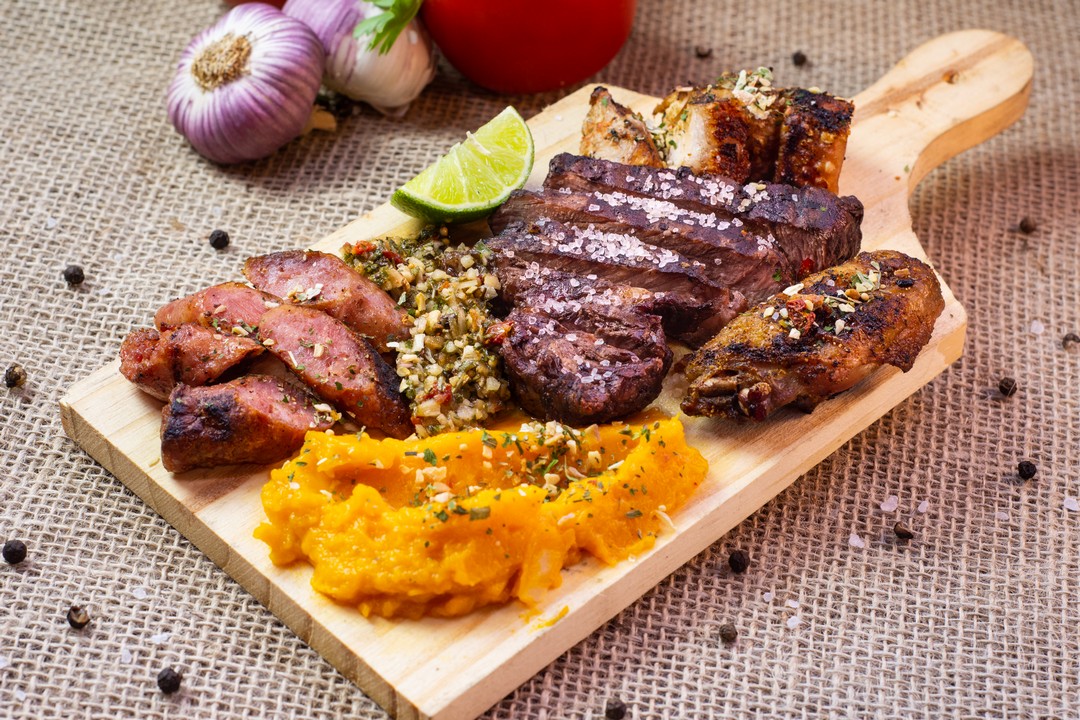 churrasco na parrilla: bife ancho, pancetta, linguiça e tulipa grelhados. Acompanha purê de cabotiá.
