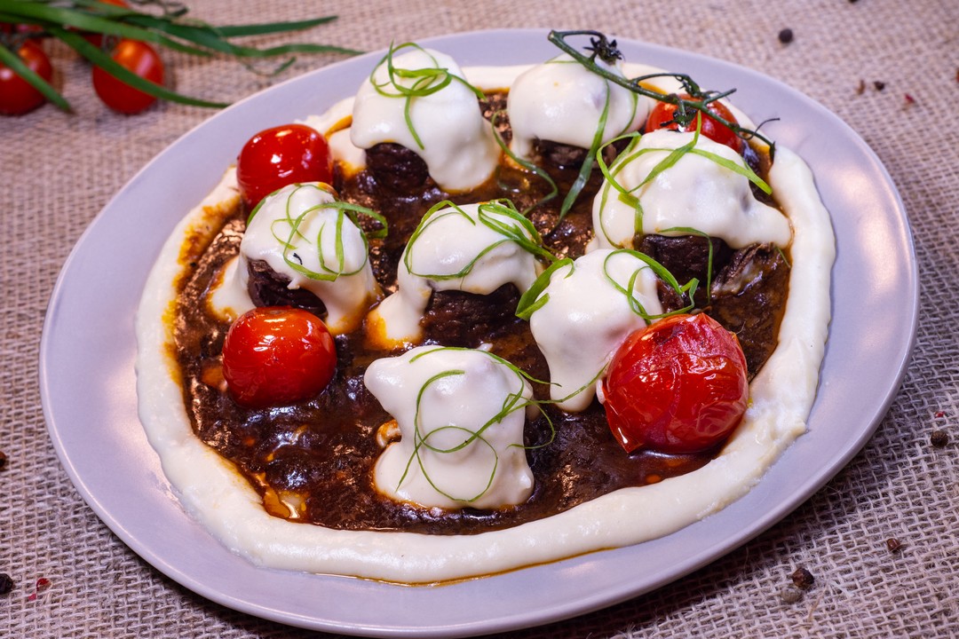 medalhão de fraldinha assada recheada com bacon, queijo e catupiry com molho especial.