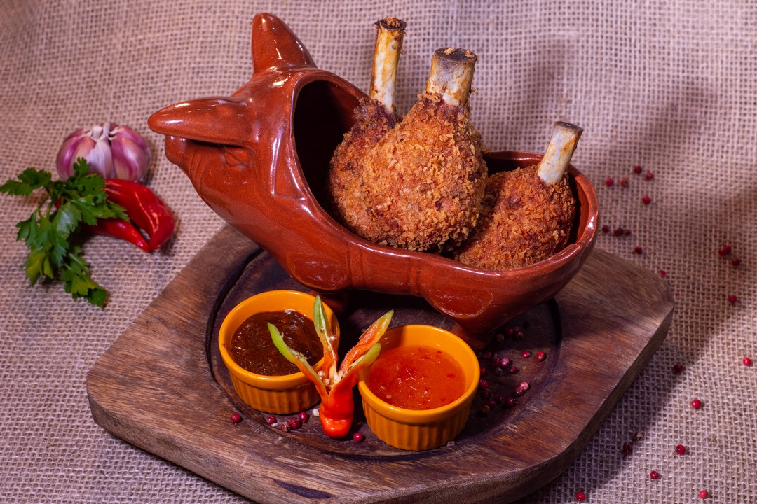 costelinha suína à toscana, trufada com queijo e especiarias, empanada na farinha panko.