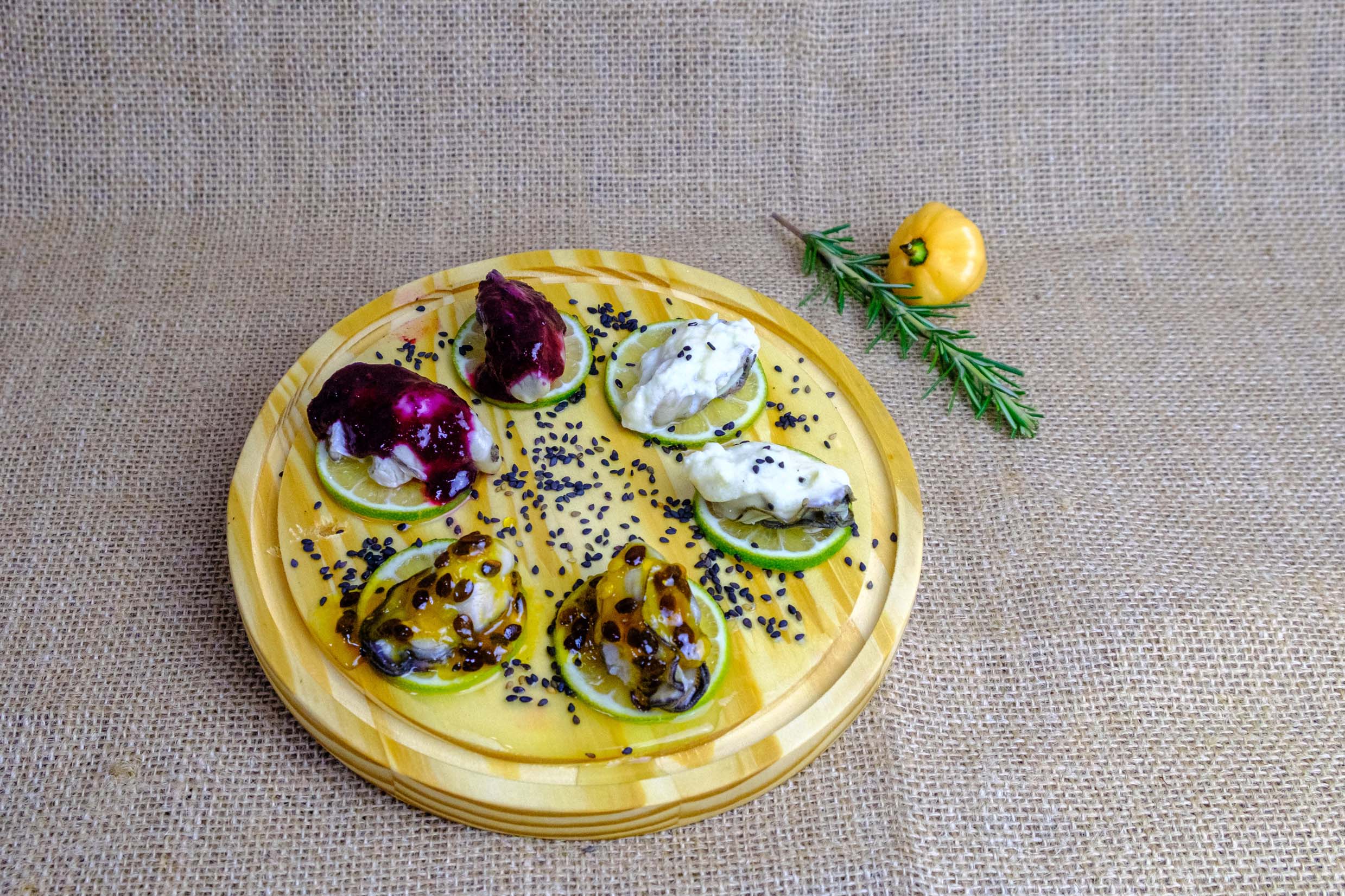 ostras com combinação de três molhos: caldo de frutas vermelhas, molho de maracujá e molho de limão-siciliano, servidas com leve defumação.