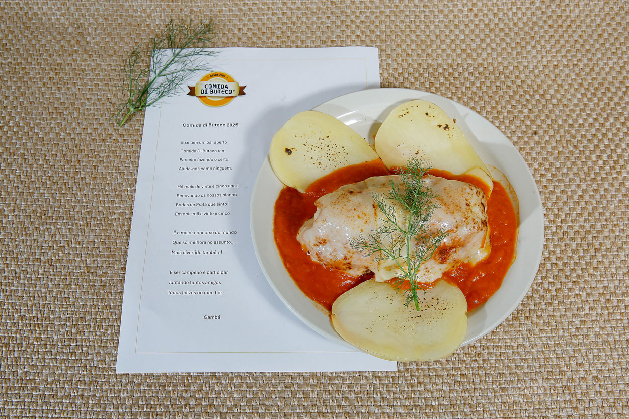 bife suíno à milanesa recheado com banana, servido à parmigiana de tomate e ameixa-preta acompanhado de batata à dorê.