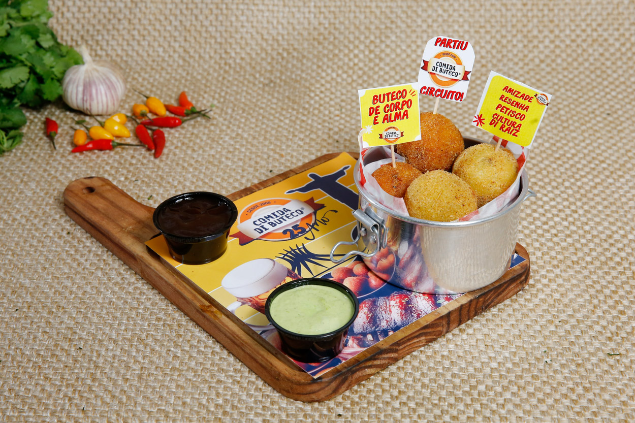 são bolinhos recheados com costela suína e cupim bovino – ambos defumados em lenha de goiabeira. Acompanha molho de maionese verde e barbecue da casa.