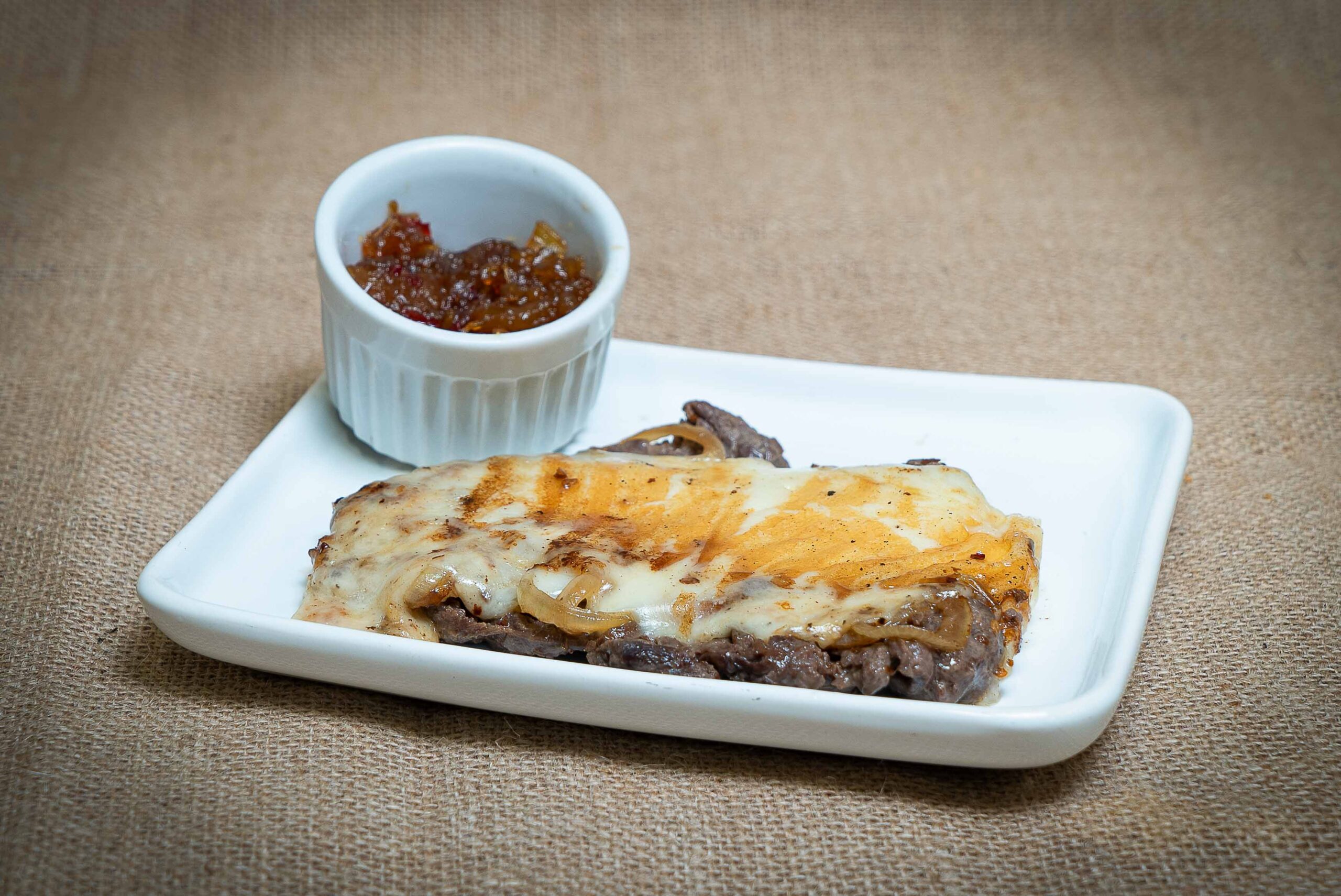 filé-mignon acebolado coberto com queijo trança assado na chapa, acompanhado de uma geleia de pimenta.