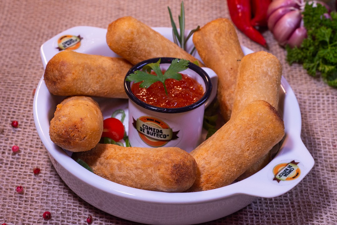 Bolinho de massa de mandioca com recheio de brisket e queijo, acompanha geleia de pimenta.