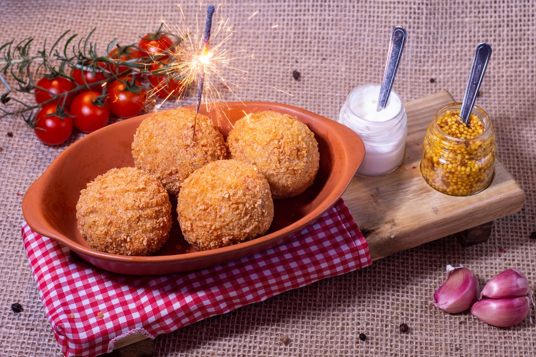 Polpetinhas recheadas com mortadela e queijo muçarela, empanadas na farinha panko. Acompanha caviar de mostarda artesanal e requeijão de pote.