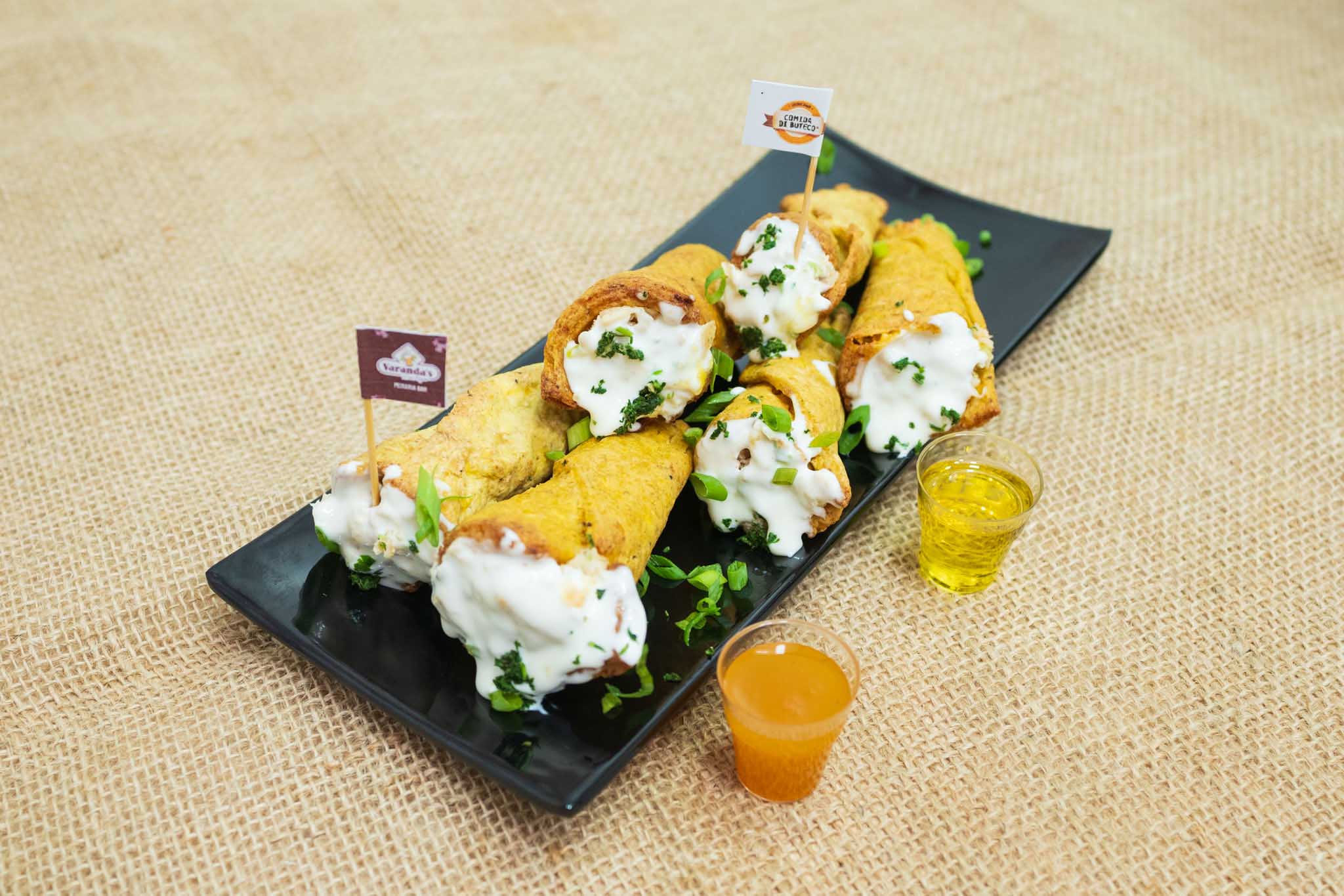 Canudinho de banana-pacova verde com recheio de tambaqui. Acompanha geleia de tucupi com pimenta.